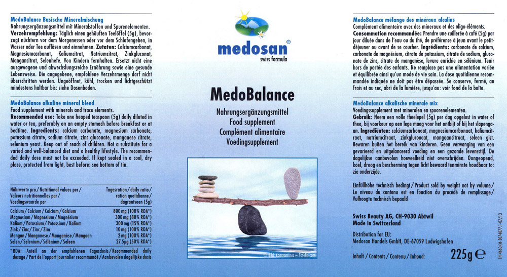 Swiss Beauty AG CH-9030 Abtwil Made in Switzerland Distribution for EU: Medosan Handels GmbH DE-67059 Ludwigshafen MedoBalance – antistes preparat, krepi odpornost in ravnotežje organizma OPIS Prehransko dopolnilo – alkalna mešanica z minerali in elementi v sledeh. NAČIN UPORABE Dnevno zaužijte 1 čajno žličko (5g), raztopljeno v vodi ali čaju pred zajtrkom ali pred spanjem (po možnosti na prazen želodec). OPOZORILO Priporočeni dnevni odmerek se ne sme prekoračiti. Prehransko dopolnilo ni nadomestilo za uravnoteženo prehrano. Shranjujte nedosegljivo otrokom ter na suhem in temnem mestu pri sobni temperaturi. SESTAVA Kalcijev karbonat, magnezijev karbonat, kalijev citrat, natrijev citrat, cinkov glukonat, manganov citrat, selen iz kvasa.